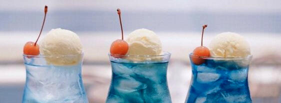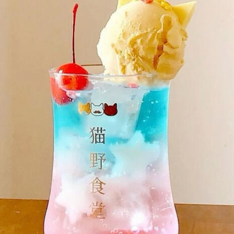 ⸻ Our signature item! Clear sodas mixed with flavored and tinted syrups served over ice and topped with vanilla ice cream from a moogle head shaped mold! Served with a spoon and straw.