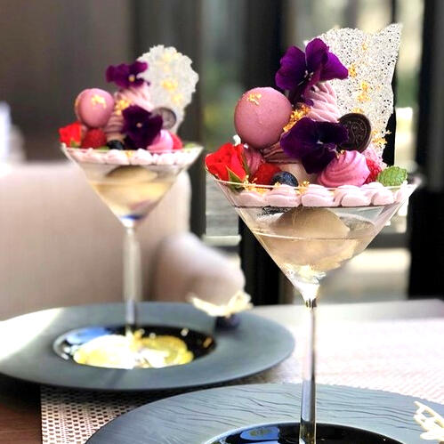 Delicious layers house made clear jelly with a small scoop of ice cream, berry whipped cream, topped with rose flavored meringue, berry flavored whipped cream, tiny macarons and sugar shards. {Rp Item: Papanasi}