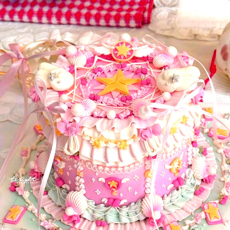A delicious cake modeled after an astrologian of legend who used a magical staff to trap souls of fae spirits in cards, harnessing their power to keep the world safe!! Vanilla buttercream, vanilla bean sponge, and filled with a delectable white peach jam and rolanberry buttercream.