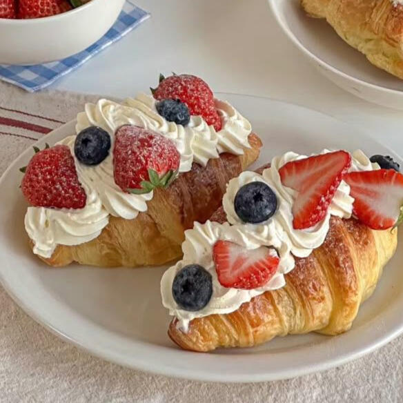 our made-daily croissant cut in half and filled with Chantilly Cream, topped with blueberries and rolanberries!