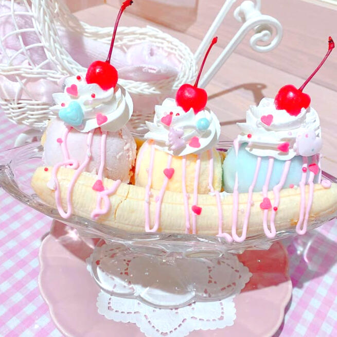 A cold treat that warms the spirit! Cherry blossom, vanilla bean and melon flavored ice cream served with a sliced cloud banana, whipped cream, cherries, a pink frosting, and heart sprinkles! {Rp Item: Shaved Rolanberry Ice}