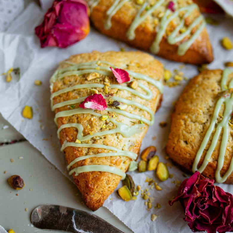 A delightful daily scone with pistachio and dried oldrose petals baked in for taste. Topped with pistachio glaze and served with house-made clotted cream.