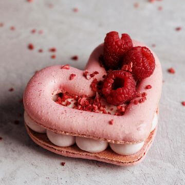 A heart shaped macaron with pixieberry topping filled with a vanilla ganache and a pomegranate jam in the center! .