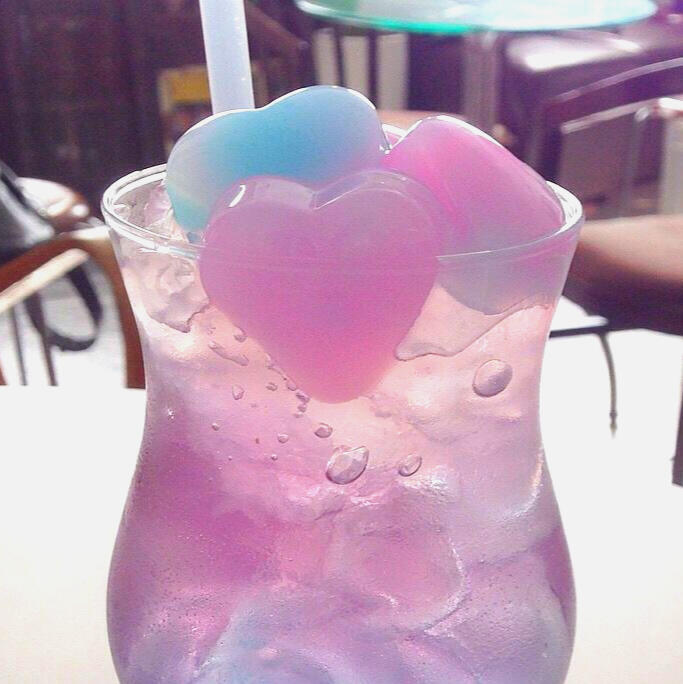 ⸻ An experimental new drink! mixed with our tinted syrups and flavored sodas, these drinks are filled with jellies shaped of stars and hearts, served with a moogle head shaped jelly on top and a straw! For those who might find cream soda a bit sweet!