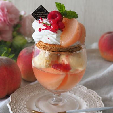 Delicious layers of a house made peach jelly, ice cream, and a thin honeycomb, , topped with vanilla bean whipped cream, peaches and pixieberries. {Rp Item: Papanasi}